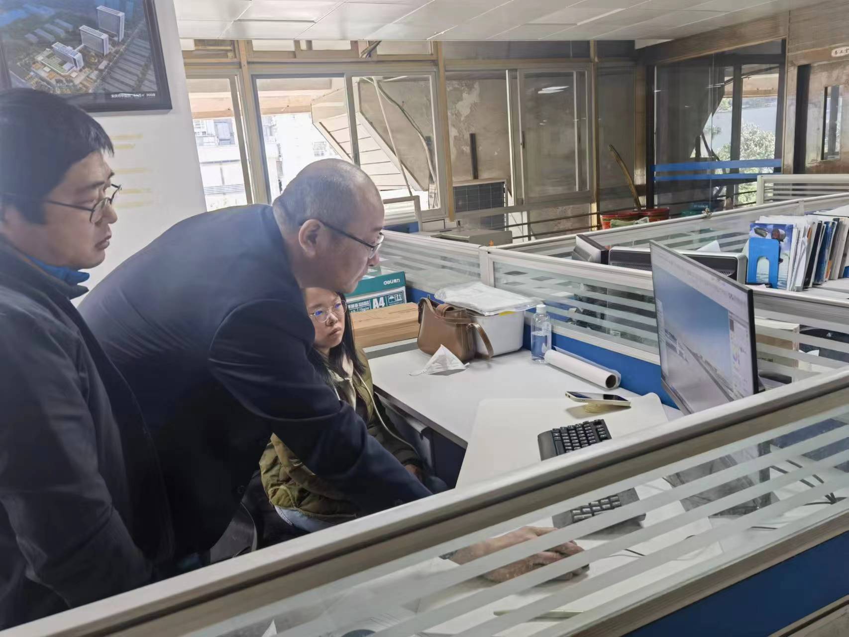 廈門分公司—廈門分公司總經理王江華與建筑所的方穎、賈云鵬正在熱烈討論金龍客車山東項目投標方案。